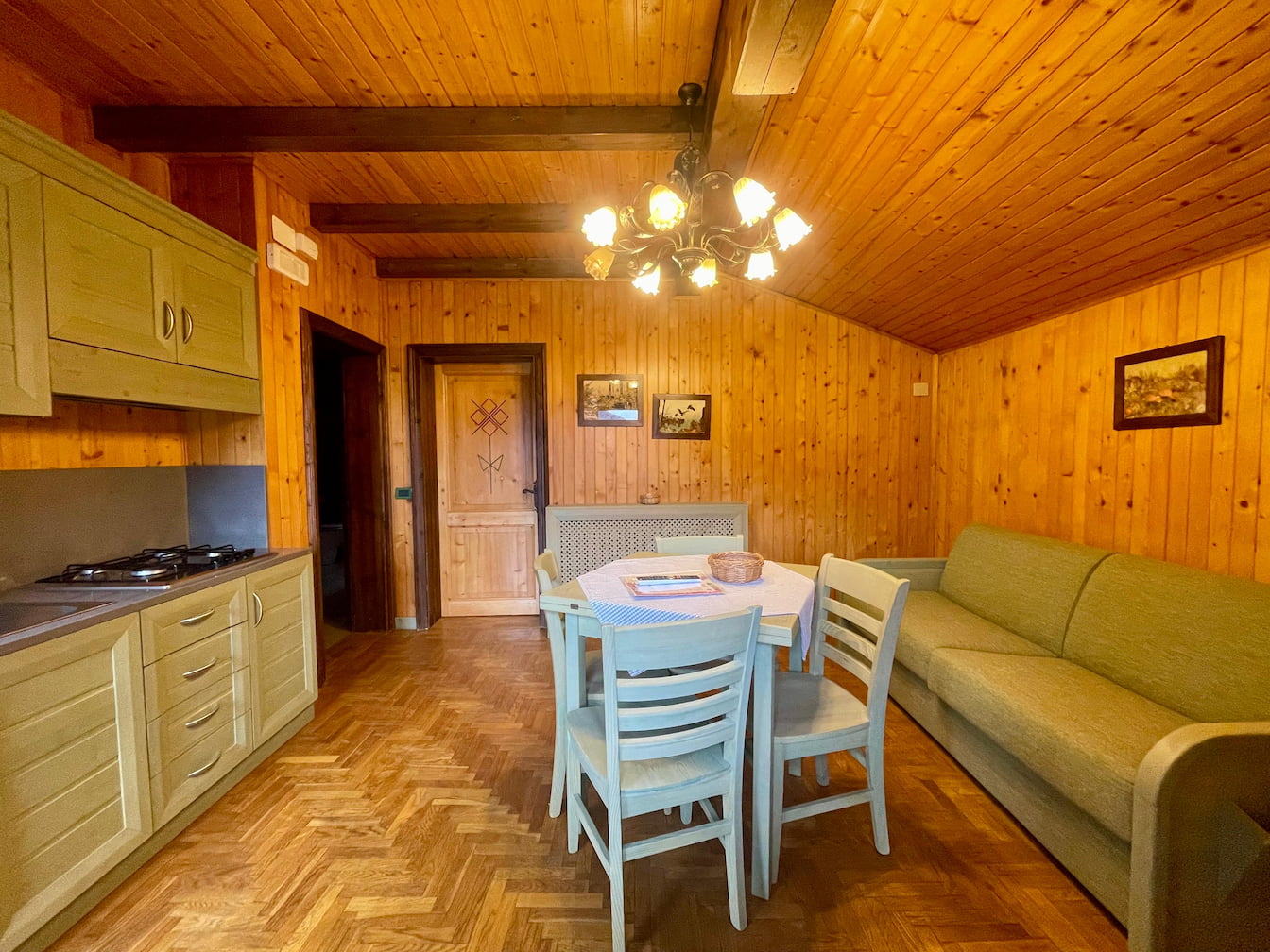 Tutti gli appartamenti sono composti da una luminosa e accogliente zona giorno, attrezzati di tutto punto con frigo, freezer, forno combinato (microonde + tradizionale), fornelli tradizionali e con un divano letto matrimoniale. Dispongono di una camera da letto matrimoniale rivestita in legno e di bagno con doccia. Il terrazzo permette di godere di un bellissimo panorama sulla vallata sottostante.