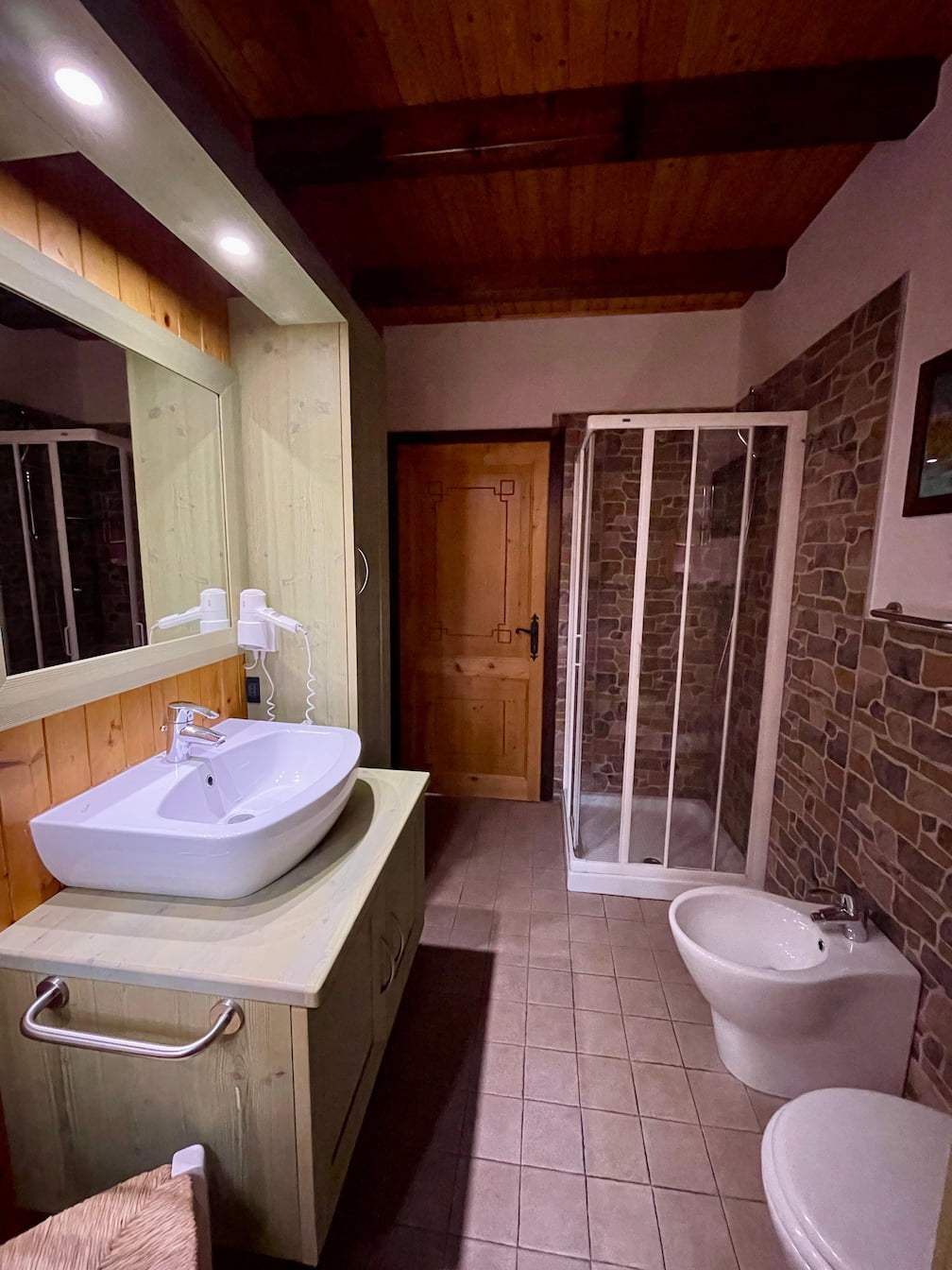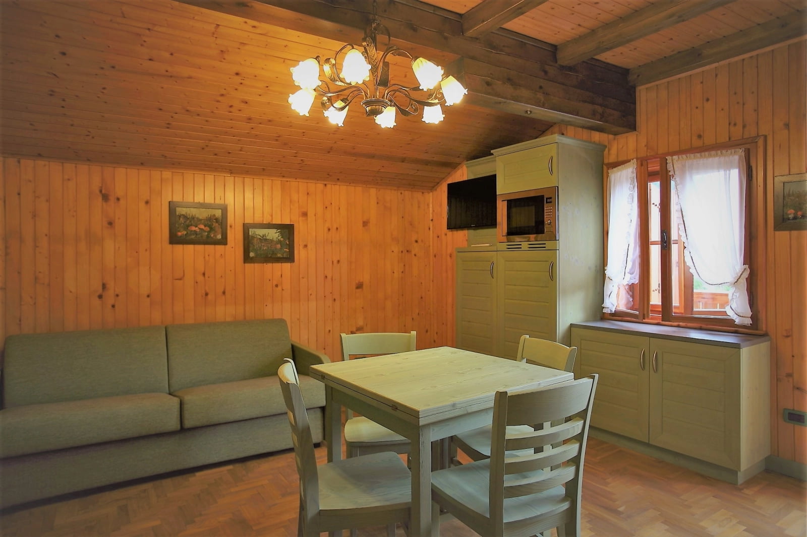 L’appartamento è composto da una luminosa e accogliente zona giorno, attrezzata di tutto punto con frigo, freezer, forno combinato (microonde + tradizionale), fornelli tradizionali e con un divano letto matrimoniale. Dispone di una camera da letto matrimoniale rivestita in legno e di bagno con doccia. Il terrazzo permette di godere di un bellissimo panorama sulla vallata sottostante.
