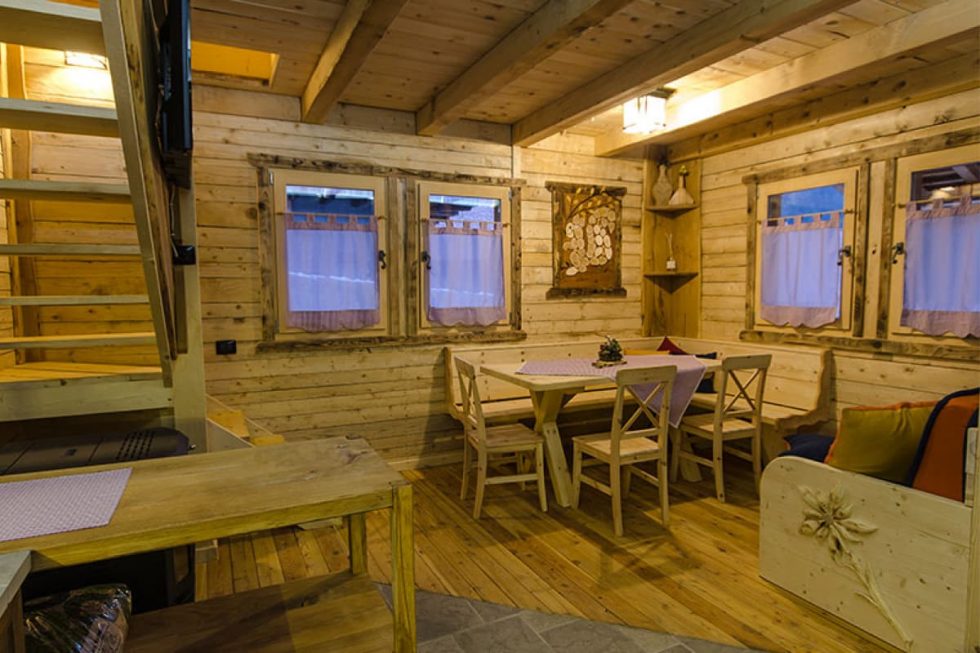 The chalet, which is entirely made of wood, is arranged over two floors plus a mezzanine and can house two to six people. The sleeping area, on the top floor, comprises a double bedroom, a relaxation area that turns into a bedroom with two beds, and a mezzanine with two beds. The living area, on the bottom floor, has an equipped kitchen and a large bathroom, split into two separate rooms, and is provided with everything guests need to feel at home.